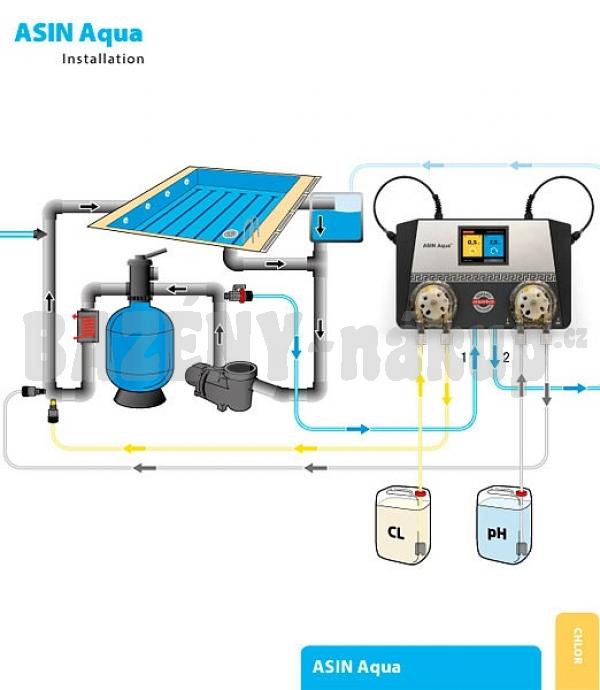 Měřená hodnota redox-potenciálu a změřené pH jsou zobrazeny na displeji. Všechny potřebné parametry lze nastavit pomocí dvou tlačítek v jednoduchém dialogovém režimu. Regulátor ASIN Aqua Redox tvoří kompaktní celek, sestávající z řídicí jednotky, měřicích elektrod a dávkovacích čerpadel o výkonu 60 ml/min.