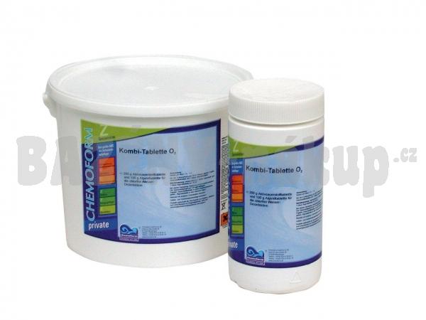 Alternativní prostředek k chlorovým multifunkčním tabletám. Kombinace dezinfekce a algicidu - 200 g tableta se skládá ze 2/3 aktivního kyslíku a 1/3 algicidu (modré jádro).