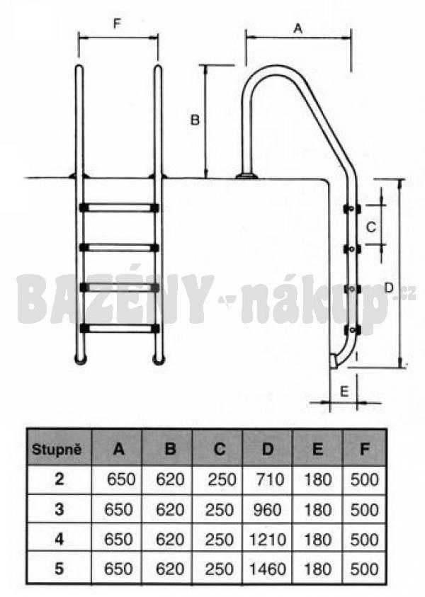 Schůdky STANDARD 4 stupně, pro zapuštěné bazény s hloubkou od 1,3 do 1,5 m.