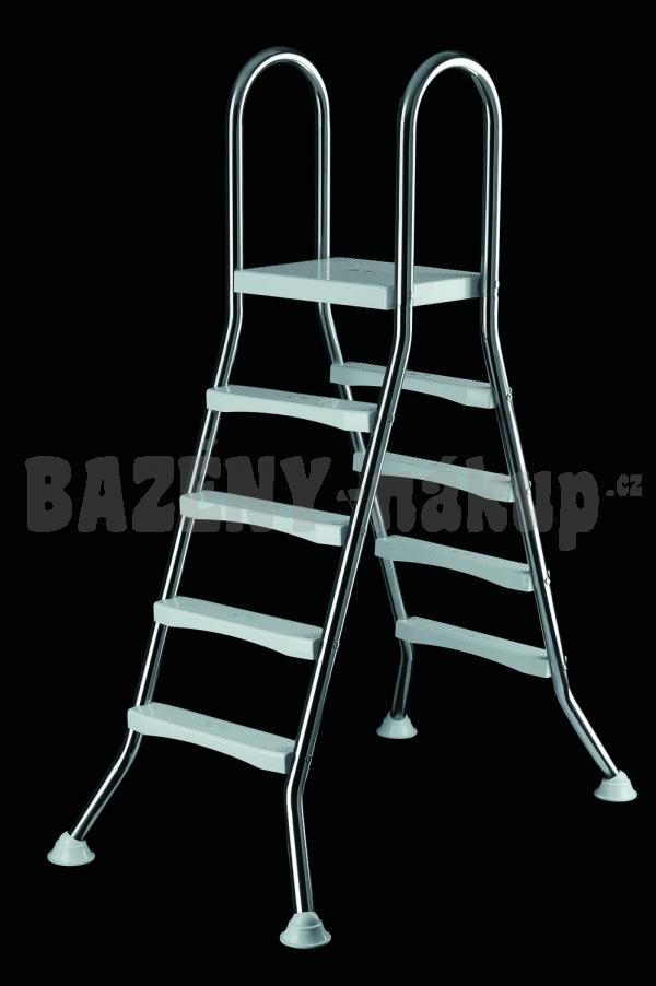 Ocelový 5/5 stupňový žebřík určený pro nadzemní, volně stojící bazény s vertikálními stěnami.